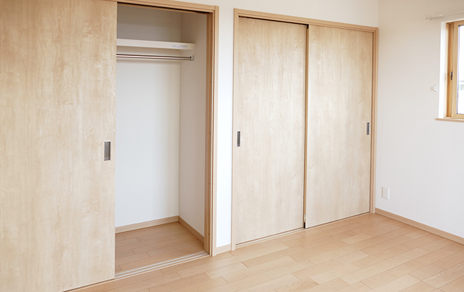 折れ戸とは、折りたたんで開閉するタイプの建具で、クローゼットなどによく見られる扉です。折りたためるため省スペースで、物が取り出しやすい反面、開口部が狭くなってしまう場合もあります。かつては子どもが指を挟んでケガをする事故が起こるなどしたため、最近の折れ戸はクッションがついていて安全性の向上を図っています。こちらもレールや溝の状態が悪くなると、滑りが悪くなる、定期的に掃除やメンテナンスを行いましょう。