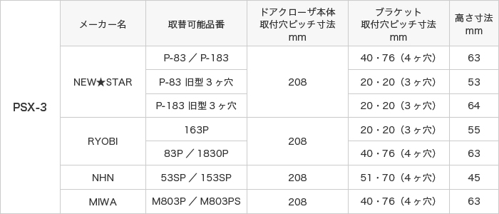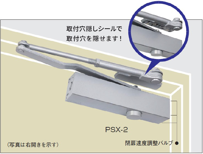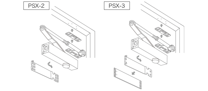 ・ドアクローザはメーカーや機種によって取り付けネジ位置が異なりますが、本シリーズのPSX-2・PSX-3は、取り付け板に複数の取り付け穴が空いており、さまざまなネジ位置に対応出来るようになっています。他社メーカー数種類のドアクローザにおいて、同じ取り付けネジ位置で交換ができます。