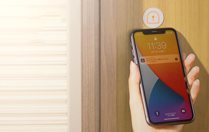 スマートフォンをかざすだけで簡単解錠。ドアに貼り付けたNFCタグにスマートフォンをかざすだけで、簡単に解錠または施錠操作が可能です。防水仕様なので、ドアの外側に貼り付けできます。最先端のIoT技術との組み合わせによって、平均約5秒というスムーズな施錠・解錠を実現し、ドアの前でもたつくストレスをなくします。
