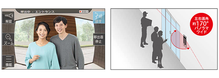 住宅情報盤に搭載された約115万画素の7型タッチパネル画面は、左右画角約170°のパノラマワイド映像で、オートズーム機能も採用しています。