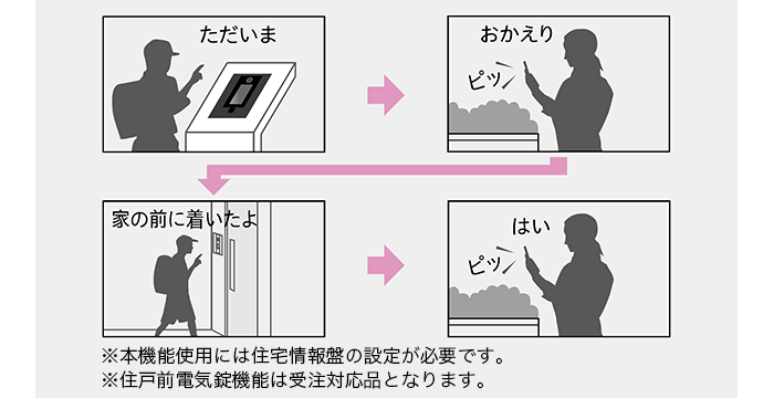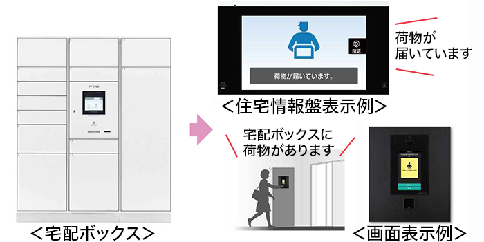 宅配ボックスに荷物が届くと、住宅情報盤の画面表示と音声で集荷をお知らせ。外出中でも帰宅時に集合玄関機が荷物のお預かりをお知らせします。お部屋に戻る前に荷物を確認できるので、荷物の取り忘れを防ぎます。