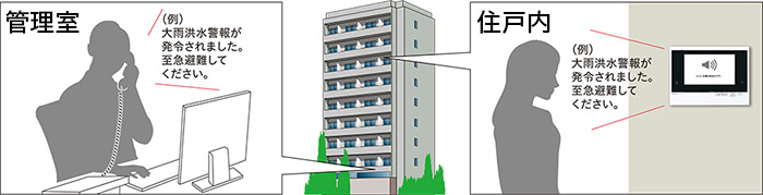 室内の住宅情報盤では管理室からのさまざまなお知らせを受け取ることができ、管理員は住戸ごとに必要な情報がけをダイレクトに伝達することが可能です。管理員が常駐せず、遠隔地の管理会社からお知らせやアンケートなどの画像メッセージを配信することもできます。