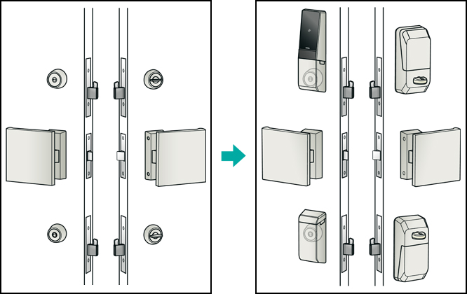 電池式ハンズフリー電動サムターンユニット「DTRSシリーズ」は、1ロック/2ロック住戸玄関用 電池式電動サムターンユニットです。既存のドアがプッシュプルでも、レバーハンドルでも後付けが可能なので、新築、賃貸、既存物件へと幅広く導入いただけます。