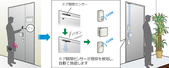 美和ロック製共用エントランスシステムと連動することで、快適なハンズフリー通行を実現。鍵(IDキー)をポケットや鞄の中に入れたまま、共用玄関やエレベータ呼び出しなどの共用部のセキュリティ箇所も住戸用のIDキーで通過することができます。お部屋に入るまで、両手に荷物を持っている場合も、鍵を取り出す手間が省けます。集合住宅によっては、宅配ボックスの開け閉めや駐車場出入口、EV自動車の充電器との連動などシステムの範囲も広がり、さらに便利にご利用いただくことができます。