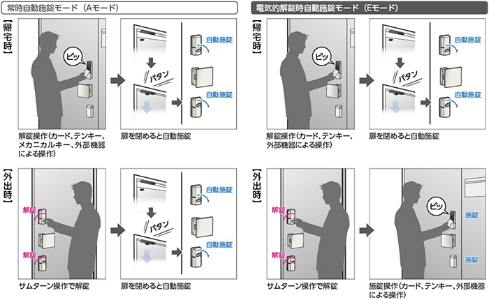 扉を開けて再び閉めると自動で施錠する自動機能があり、「常時自動施錠モード」と「電気的解錠時施錠モード」の2種類からお選びいただけます。