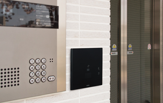 共用エントランスのオートロックも、住戸玄関と同じFeliCaカードで解錠が可能です。連動させる場合、専有部(PiACK II smart)はFKLカード等の専用IDで認証させ、共用部システムは“IDm(=FeliCaの固有ID)”で認証させます。