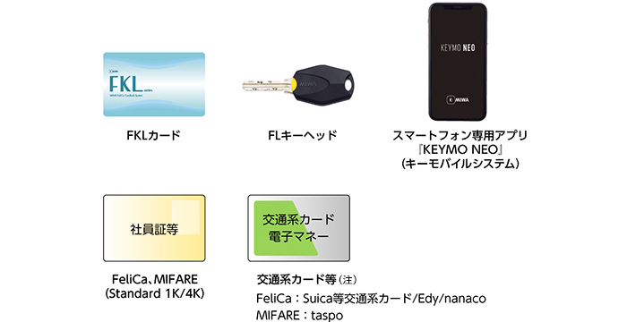 美和ロック社のFKLカード、キー一体型のFLキーヘッド、スマートフォンを合鍵として使用することができる スマートフォン専用アプリ(KEYMO NEO)に対応しています。その他、設定カード(有償)を使用することで、お客様がお持ちの社員証等(FeliCaまたは、MIFARE)を利用することもできます。また、交通系ICカード等の製造番号を認証IDにすることも可能です。