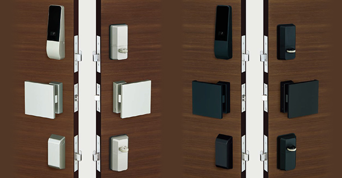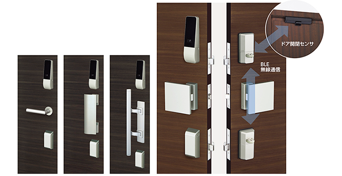 2ロック仕様および自動施錠仕様は、上下ユニット間、上部ユニット・ドア開閉センサ間の連動をBLE(Bluetooth® Low Energy)によって無線化し、配線もなくスマートな外観です。1ロック/2ロック仕様のどちらも任意のハンドルタイプ(レバー、プレート、バー)との組み合わせが可能です。室内外のユニット、ドア開閉センサ共に扉への追加工や配線工事が不要な電池式のため、施工費を抑えることができます。