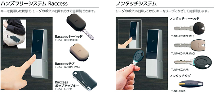IDキーは、美和ロックの集合住宅向けハンズフリーシステム「Raccess(ラクセス)」と「ノンタッチ」の2種類に対応しています。