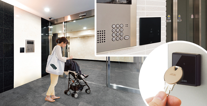 集合住宅の場合、共用エントランスシステムとの連動が可能で、共用玄関やエレベータ呼び出しなどの共用部セキュリティ箇所も住戸用のキーで通過できます。