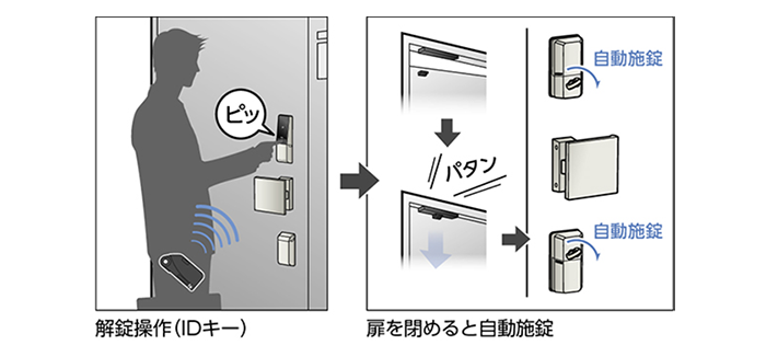 IDキーで解錠後、扉を開けて再び閉めると自動で施錠します。また解錠後、扉を開けないで20秒経過すると自動で施錠します。