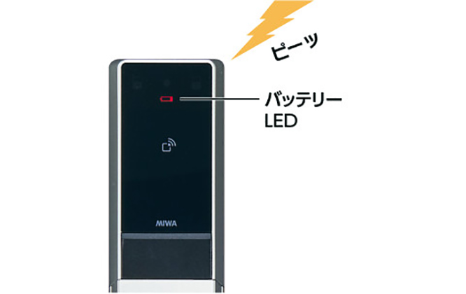 ロック本体またはRaccessキーの電池残量が少なくなったら、音とLEDで警告します。万一電池が切れた場合でも、9V角形電池を使って室外側から電源供給することが可能です。